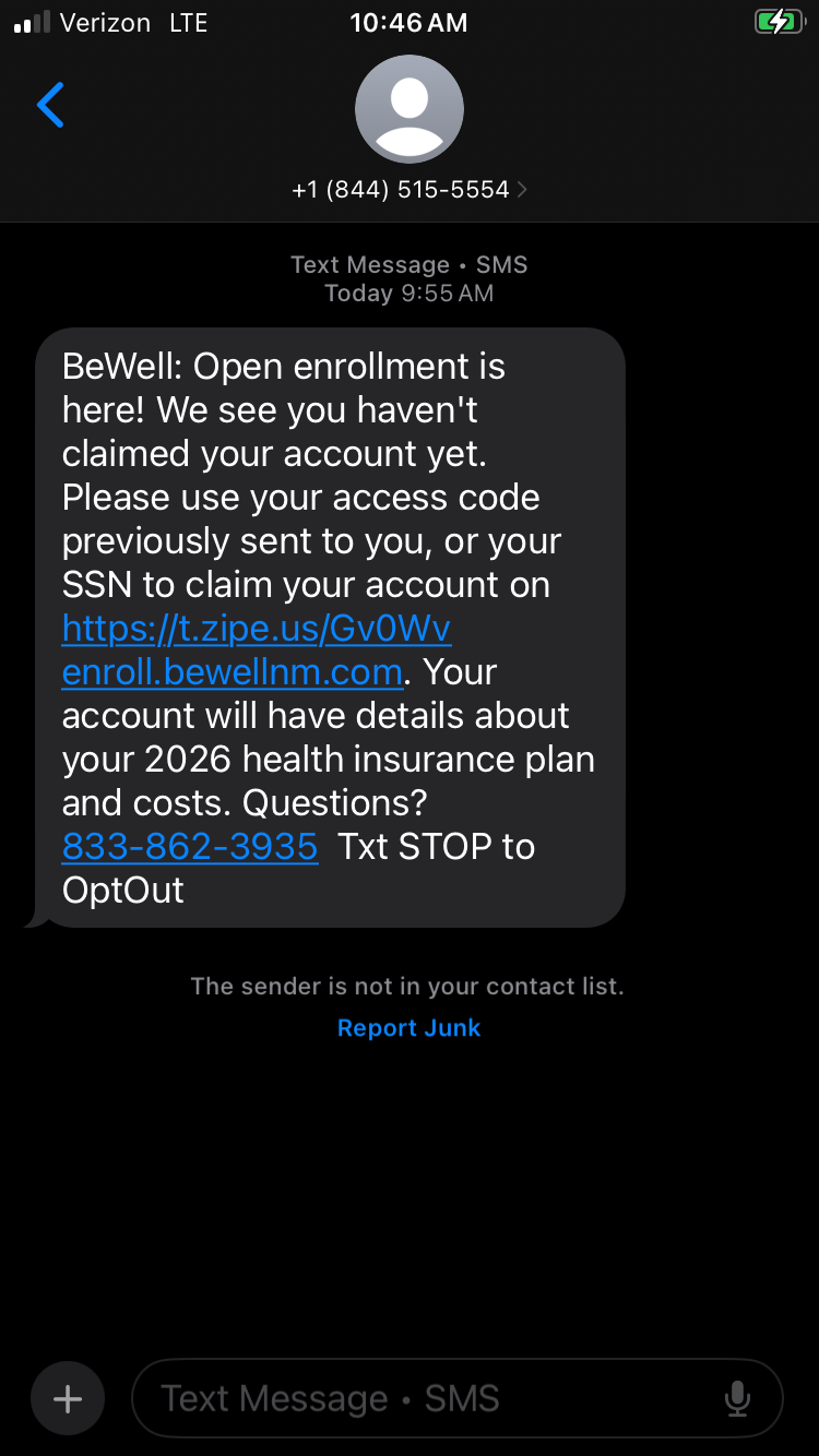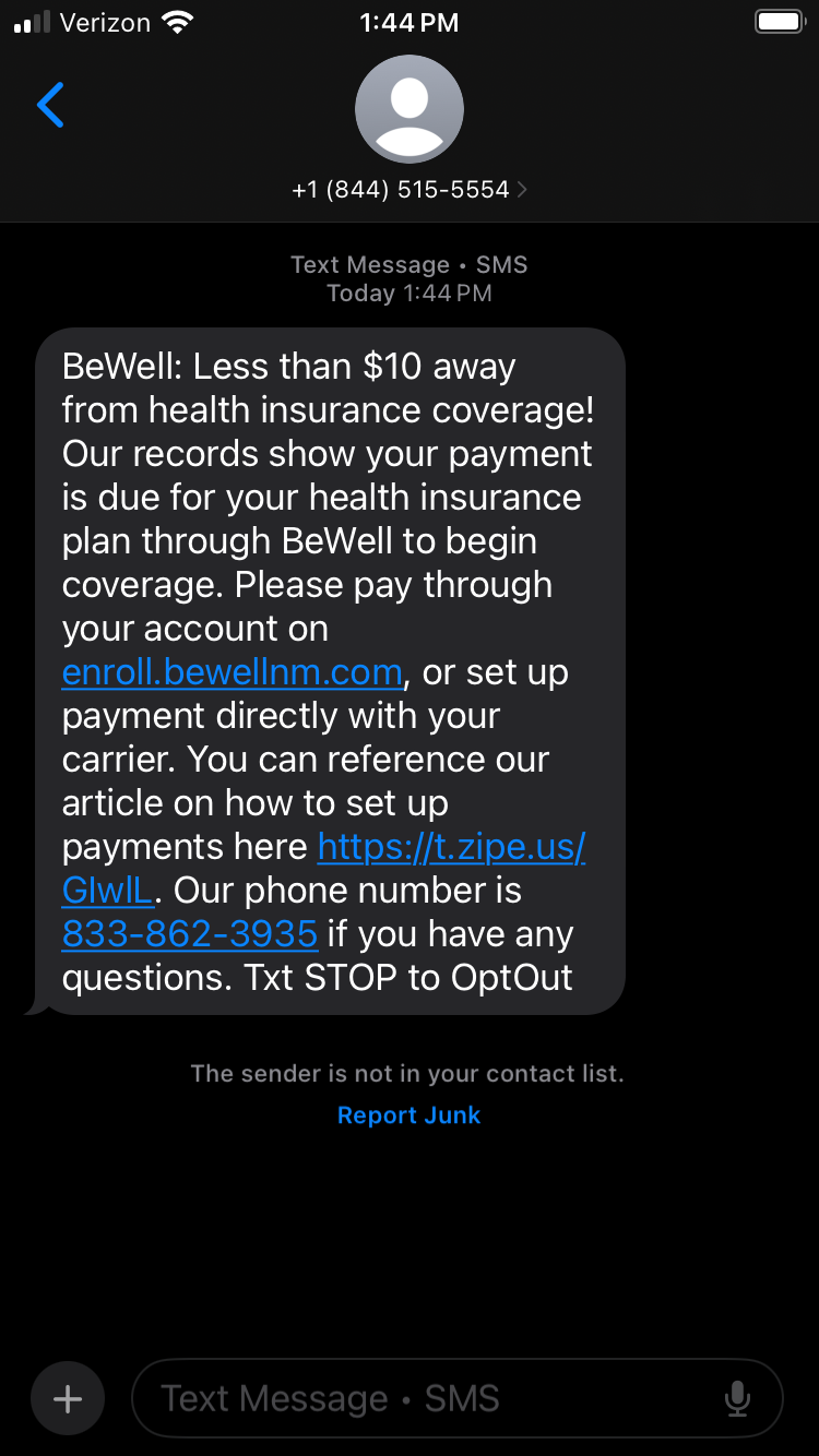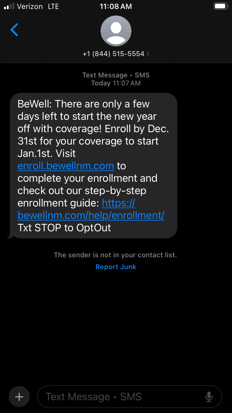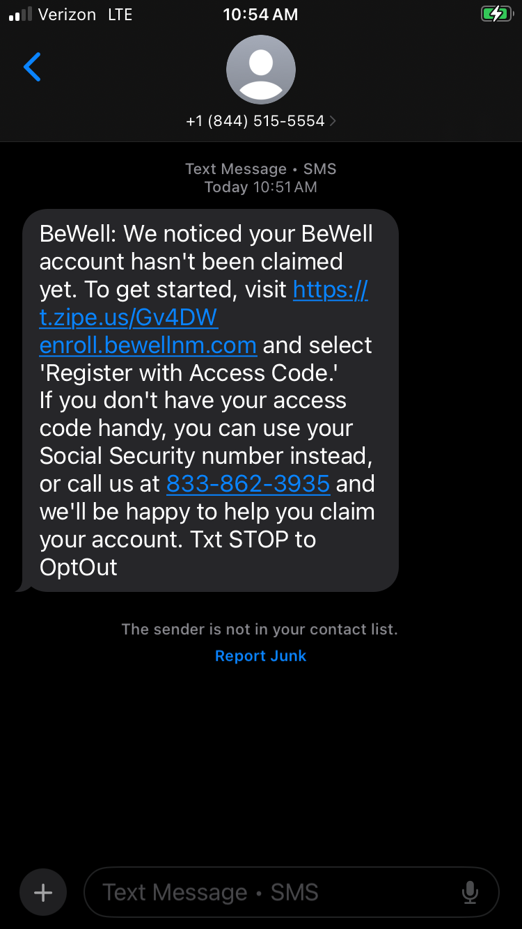 To protect yourself, remember: BeWell will only email you from info@bewellnm.com or noreply@bewellnm.com and only text you from 844-515-5554. If a message doesn’t come from us, it isn’t BeWell.