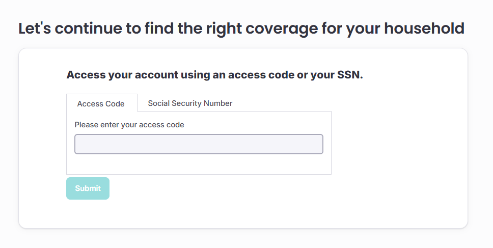 You will be prompted to enter your access code or Social Security number to claim your pre-loaded application. Your access code is an eight-digit code with only letters (no numbers).