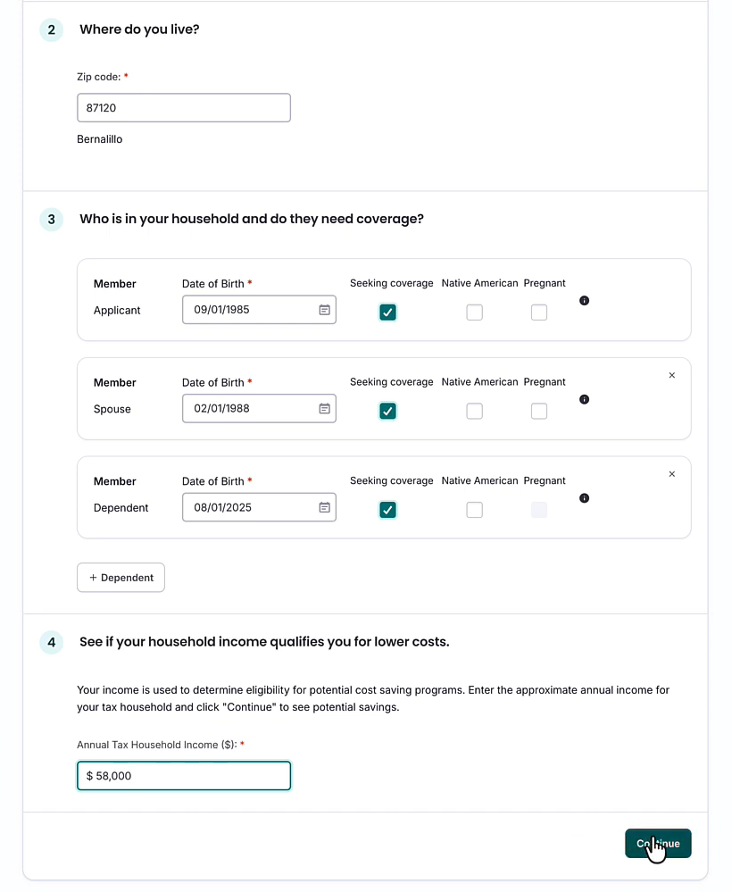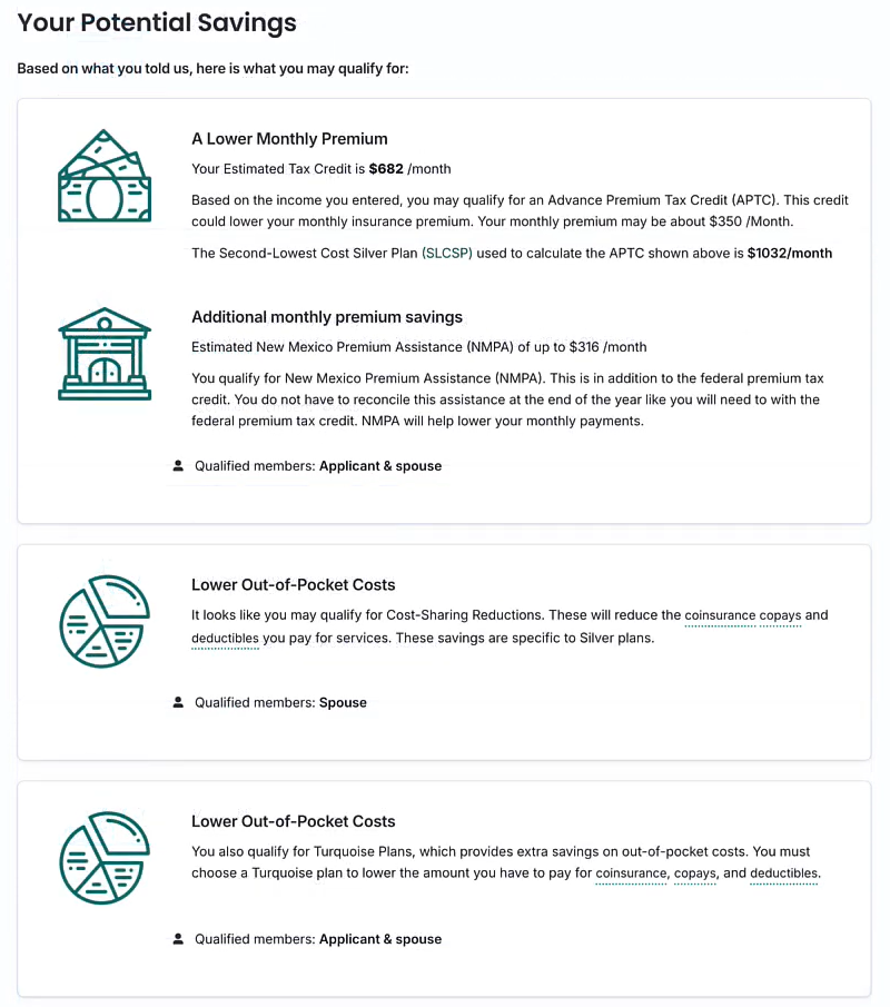 Click “Continue” to view your potential savings results. Including if any of your household members may qualify for Medicaid. These results are only an estimate. You will need to complete an application to get an official determination.