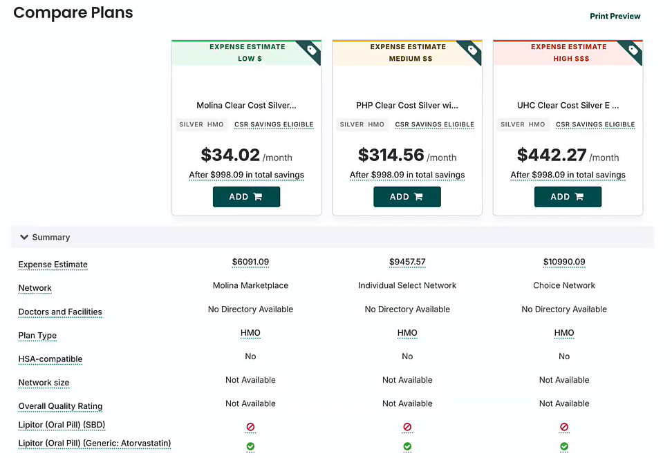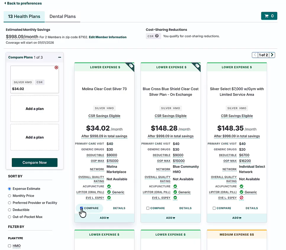 You can compare up to three plans at a time to see their differences in coverage, review deductibles, out of pocket expenses, and more.