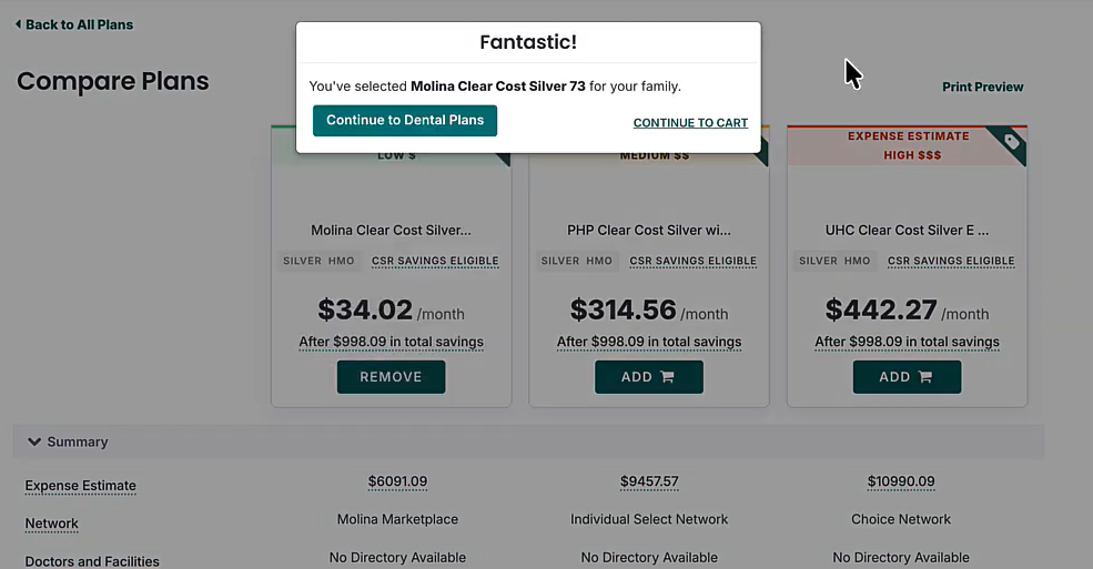 When you are ready to select your plan, click “Add” to add it to your cart. You can then search for dental coverage, or if you do not need dental coverage you can click “Continue to Cart” to go straight to your cart.