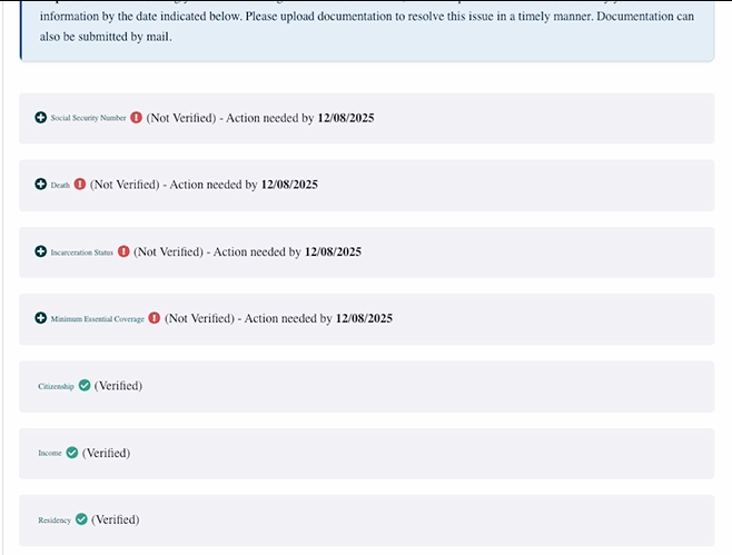 Look for items marked as “Not Verified” (red exclamation point) for each household member. You can switch between people by clicking on their names. When you click the “Not Verified” field, you will get directions to upload the required documents.