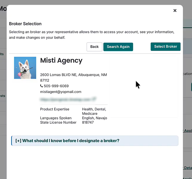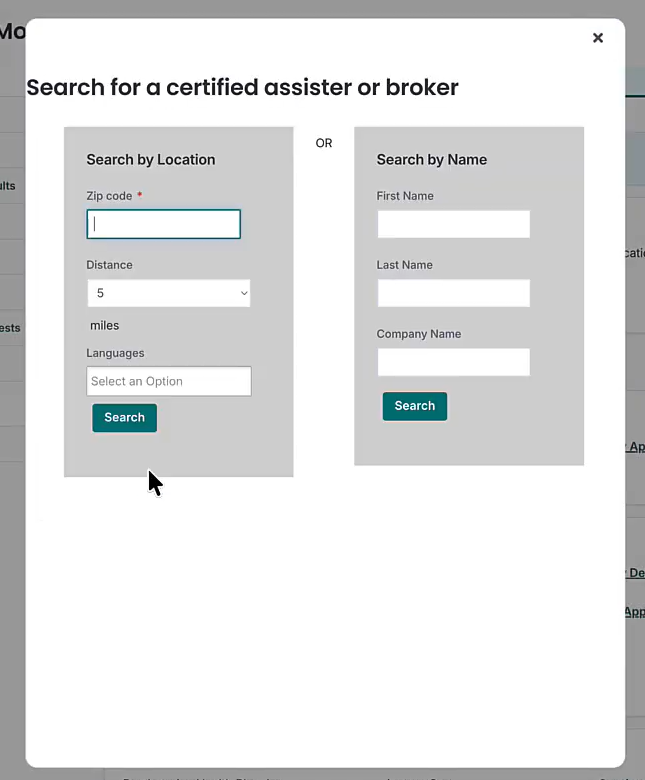 If you already know who you would like to be your assister, please enter their name in the boxes on the right-hand side and click “Search” to find them. If you would like to search assisters by location, just enter your zip code, enter the distance, choose your preferred language, and click “Search”. This will bring up all the brokers in your area. Click on their names to view their profiles and view more information about them.