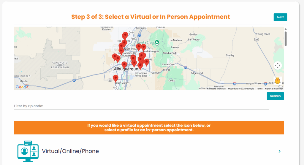 If you would like a virtual appointment, click the “Virtual/Online/Phone” option under the map, then select a broker to begin scheduling your virtual appointment.