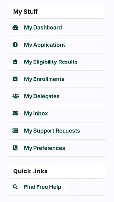 The “My Stuff” panel on the left-hand side of the dashboard allows you to easily navigate to different sections of your portal, including your application eligibility, results, secure inbox, and more.
