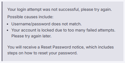If you receive this notice, it could mean your username or password is incorrect, you have too many failed login attempts, or that your account has been locked.